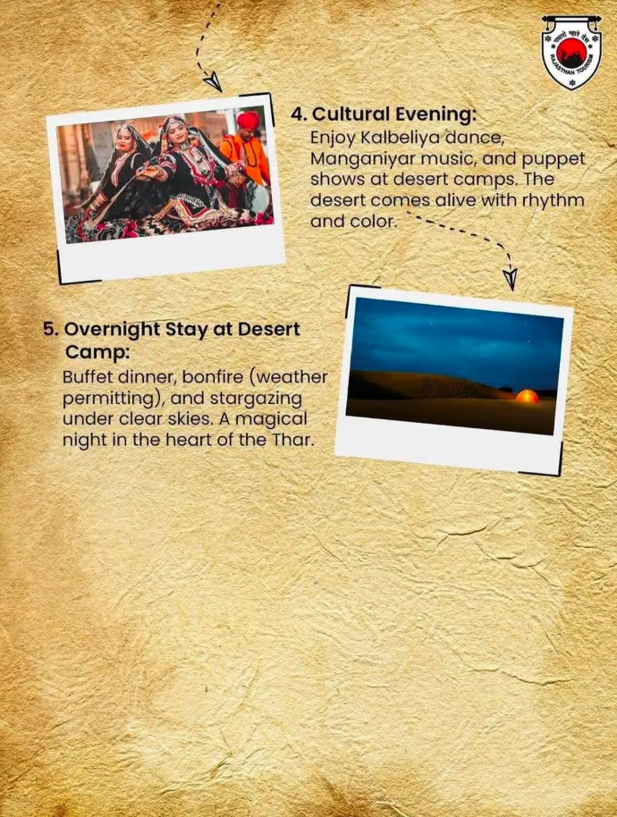 Discover the magic of Jaisalmer with our curated tour packages that promise unforgettable experiences. From exploring the historic city and its iconic landmarks to thrilling desert adventures, our packages are designed to immerse you in the culture, beauty, and charm of the Golden City. Whether you’re looking for a half-day escape, a full day of exploration, or an overnight desert adventure, we offer tailored options to suit your preferences. Let us guide you through mesmerizing landscapes, vibrant traditions, and the tranquil desert under a starlit sky.